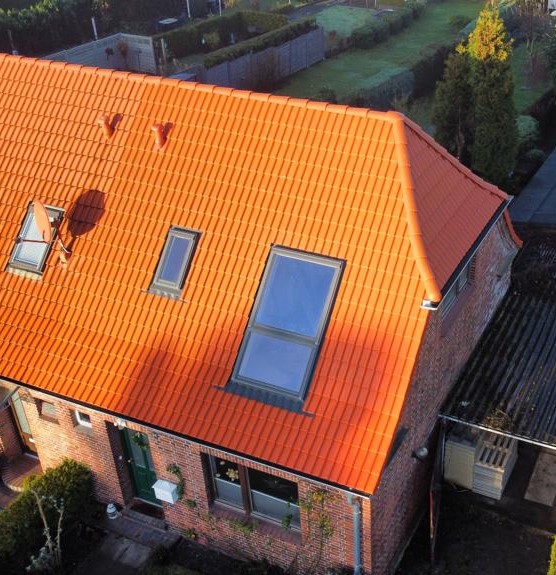 Sanierung eines ca. 90 Jahre alten Daches. Dabei wurde gleich eine Modernisierung im Sinne von neuen großen Fenstern, sowie einer energetischen Dämmung geschaffen. Zudem wurde auf die Angleichung der Dachziegel zum Nachbarn geachtet und die Regenwasserleitung neu verlegt.